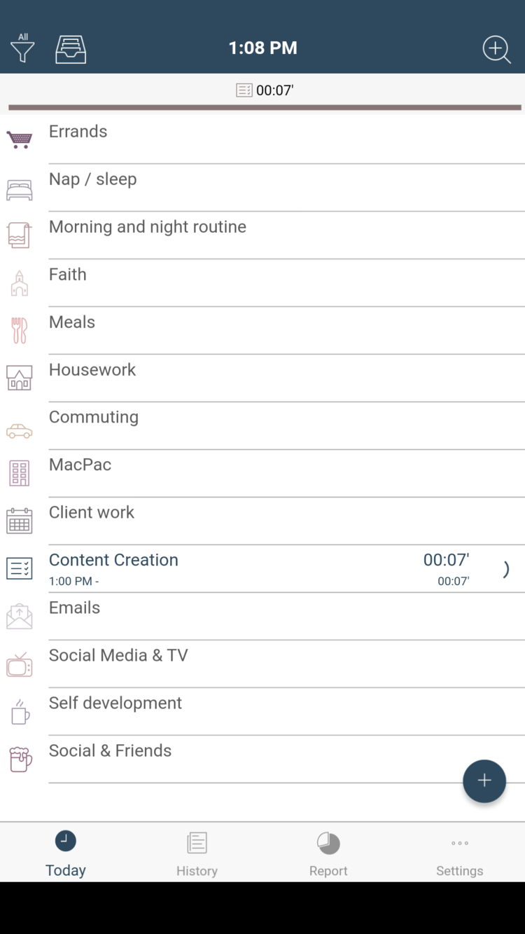 When I set up my app, I used 14 different categories. This may seem like a lot, but after a month of doing this, I’ve had the chance to edit, rearrange and combine some categories until my system worked perfectly for me. If you wanted to split things up simply you could do Work, Fun, Personal, and Sleep. Here are the categories I used: