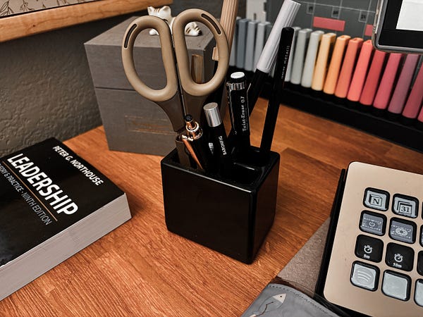 You don’t need this specific set, but having a pen stand and desk organizer helps tidy loose pens and paper in a way that looks much nicer. I use index cards, sticky notes, tape, and trackers throughout my day, but having them sit around makes me feel more cluttered. I love this set and use it every single day. This one caters to my needs with the included sizing — so make sure you find one that works for your on-hand tools.